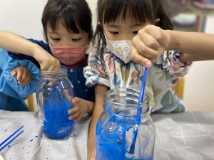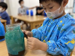 After that, the kids started work on their lanterns. First, they had to paint the inside of their jar with either green, blue or yellow paint.