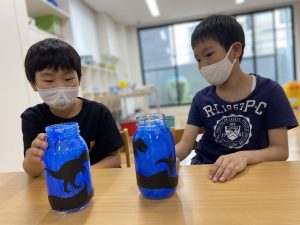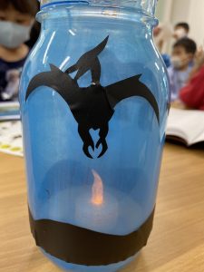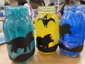 Finally, the kids cut out dinosaur stickers to put on their lanterns, and we put small lights inside them.