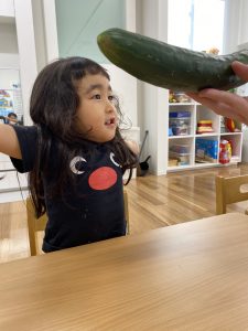 まずはMike先生から説明を聞きます。Green leaves! Look! Cucumbers! と子ども達からも声があがります。