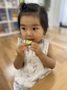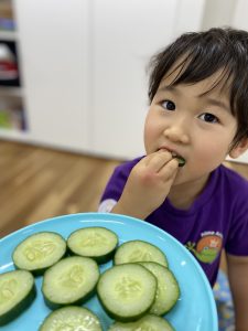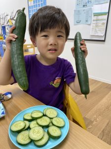 大好きなお菓子よりもPAPの畑から採れたフレッシュキュウリの方がおいしかった様です。