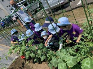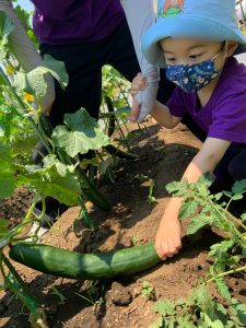 次々と自分たちの畑からできたキュウリを収穫します。