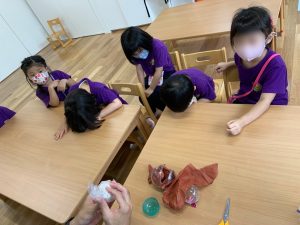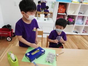 Porcupinesクラスでは、Hannah先生が卵に顔を描き、名前を付けて、お友達のEggbertをみんなで守るプロジェクトだよ!と説明。