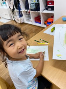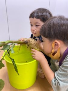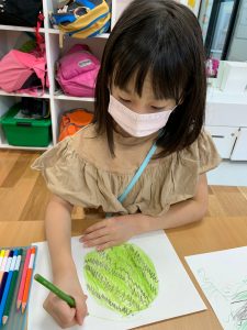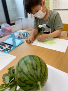 黄色いキュウリ、ツタのついたままのスイカや、根っ子付きのピーマンの苗…等、スーパーではなかなか見られない野菜の姿を観察することが出来ました。