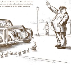 パトカーまで出動して大騒ぎですが、驚く人間たちをよそに、Mrs.Mallardとducklingsは、すまして一列に歩いて行くのでした。