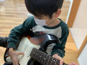 Acoustic guitarに比べると、かなり重いようです。先生の支えがないと、子ども達だけでは持てない重さです。