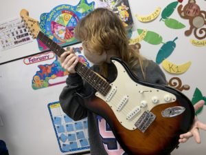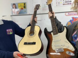 子ども達は、”It’s plastic!” という意見でしたが、実はElectric guitarも、木で出来ているんです。