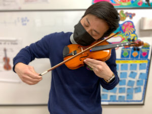 バイオリンの持ち方、Bowの当て方、当てる場所、全て年長さん達が教えてくれました!