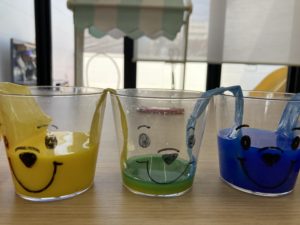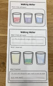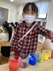 Wow! 紙が色水を吸い込み色がどんどん上へ登って行きます。これが”Walking water” ですね