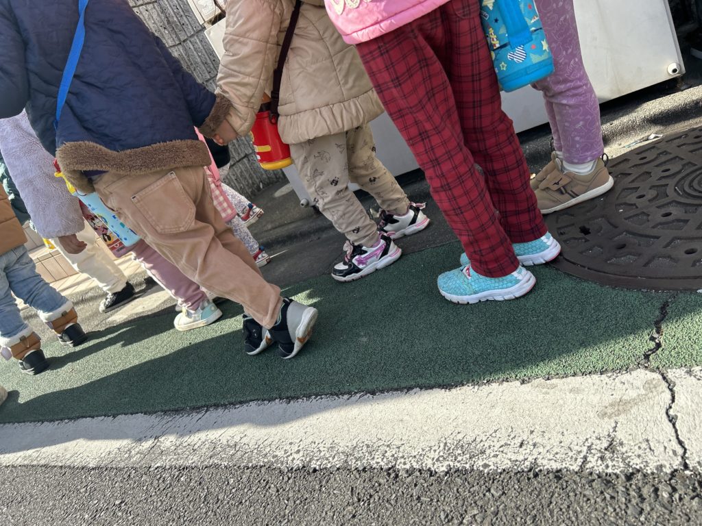 ペアになってきちんと並び、列を乱さずしっかり歩きます。歩くのは、必ず白い線の内側です。