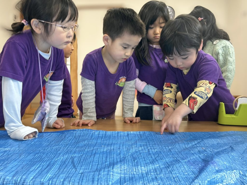いつもTeam workが抜群の年少さんのみんな、ピクニックシートをテーブルに取り付けています…