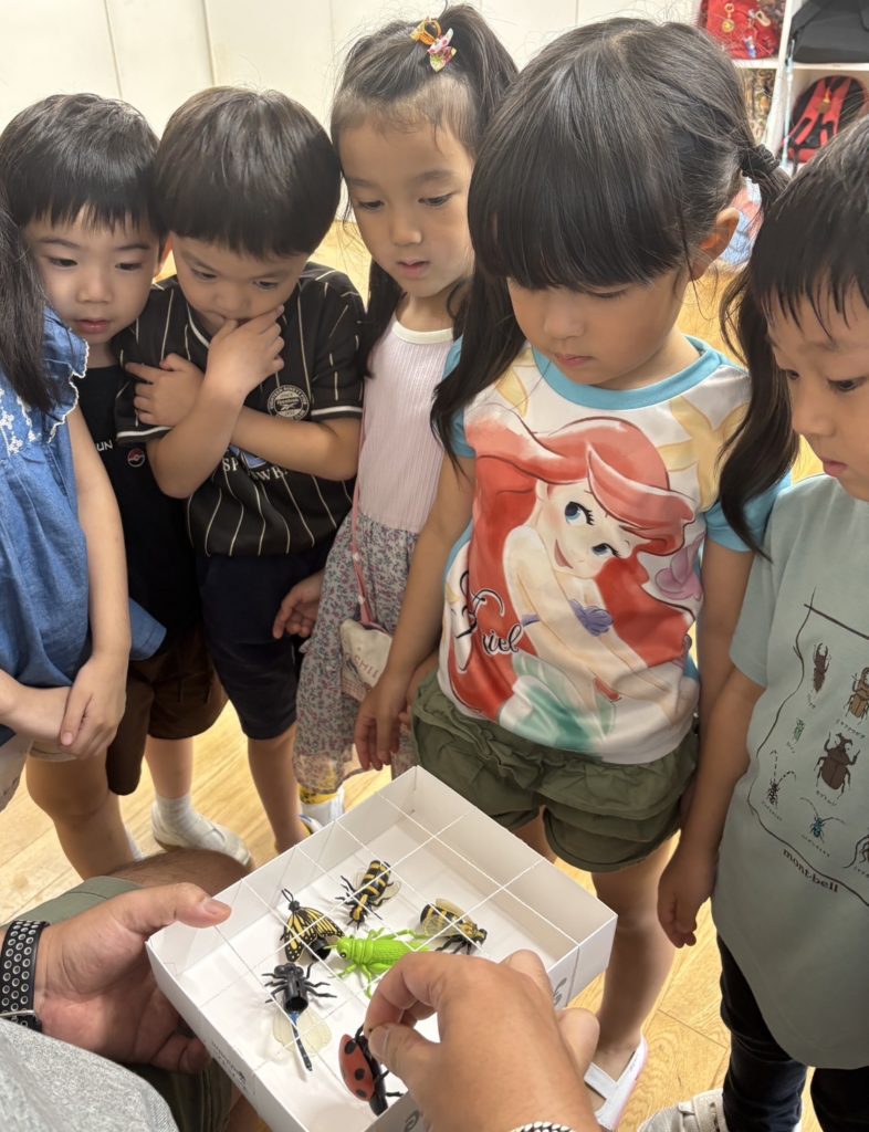 「虫に触るときは優しくね」と声をかけると、みんな夢中になって楽しんでいました。