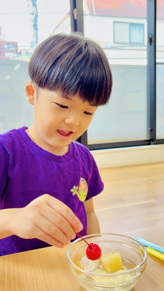 ゼリーにトッピングする、フルーツやホイップクリームは、皆で行いましたよ♪