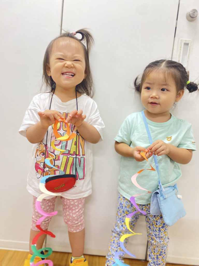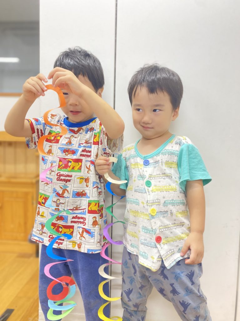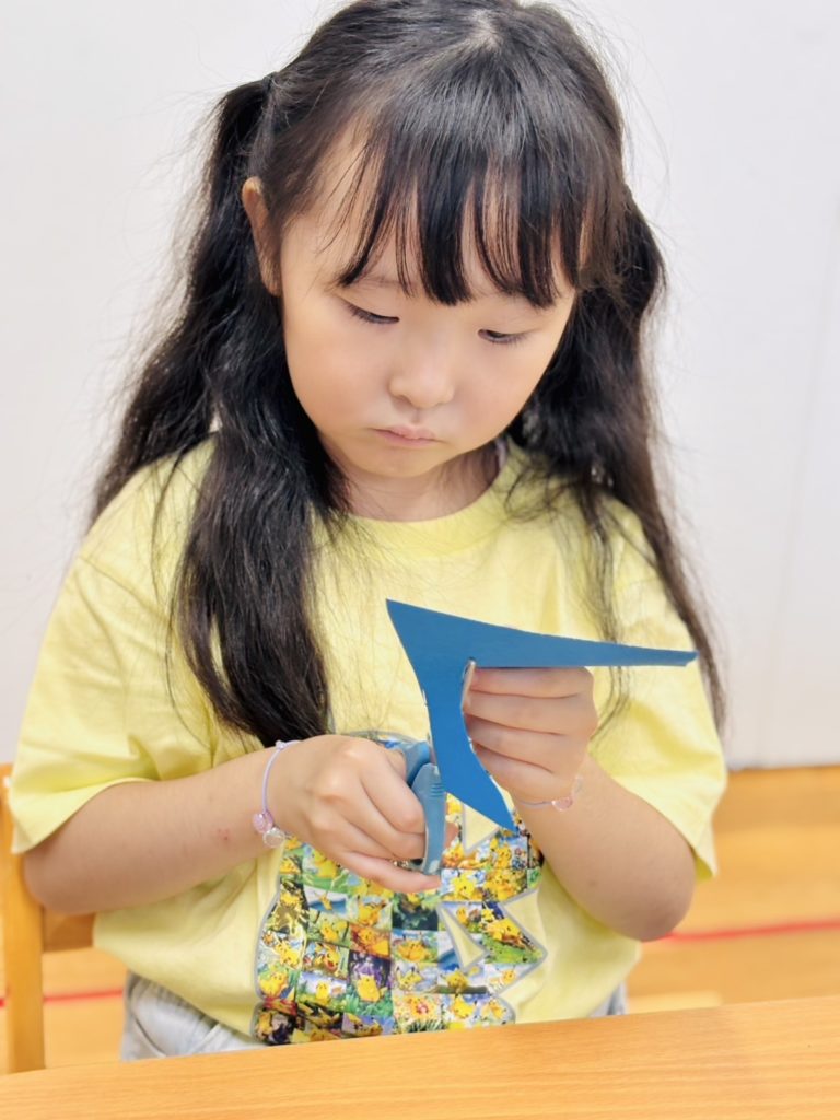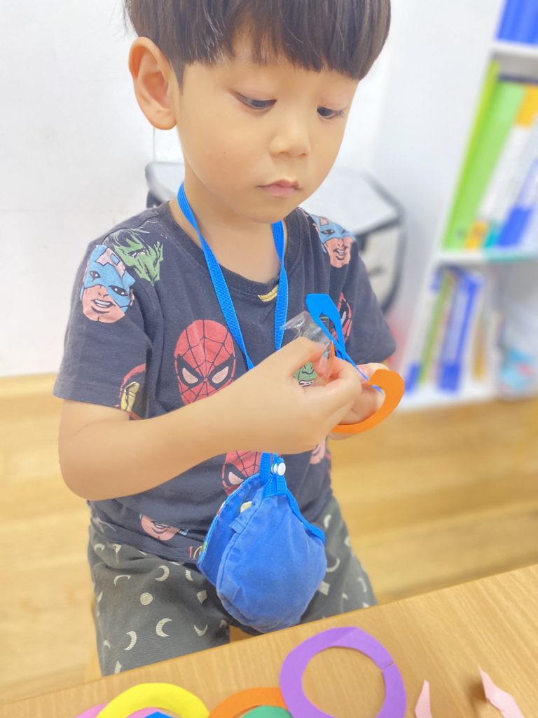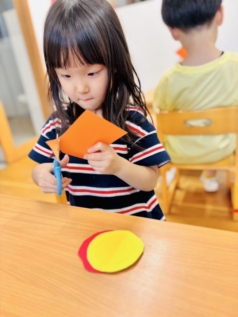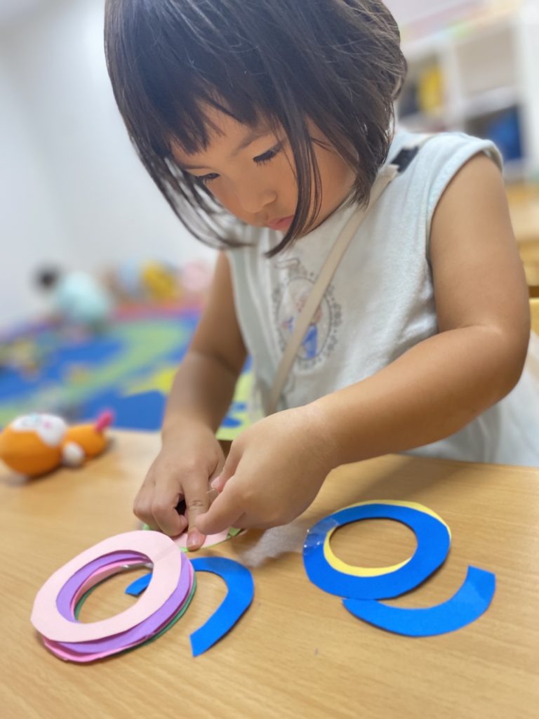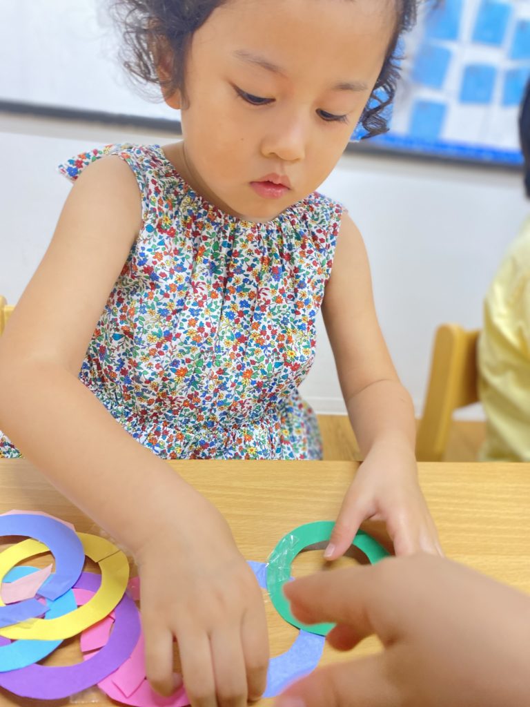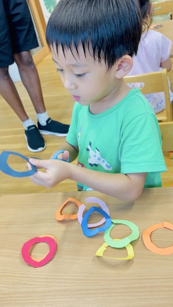 K2・K3の子どもたちは、はさみを上手に使ってリング作りに挑戦。線に沿ってきれいに切ることができていて、成長を感じる場面もありました。