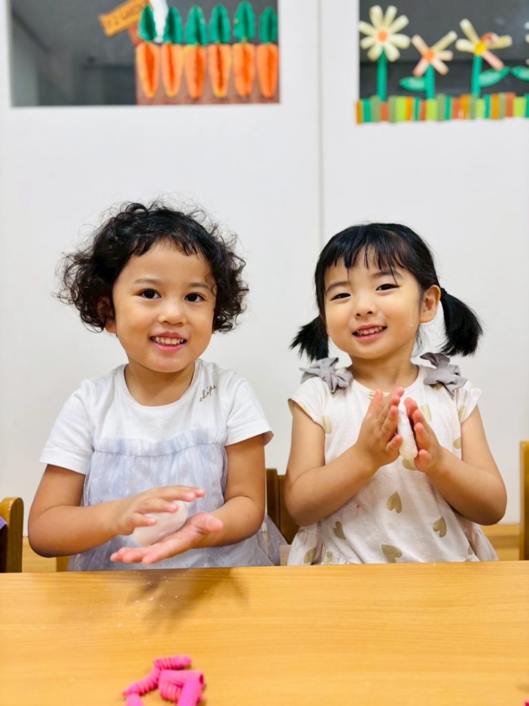 まずは土台作り。小さな手で一生懸命コネコネと粘土を丸めて、手のひらでギュッと押して平らな土台を完成させました。