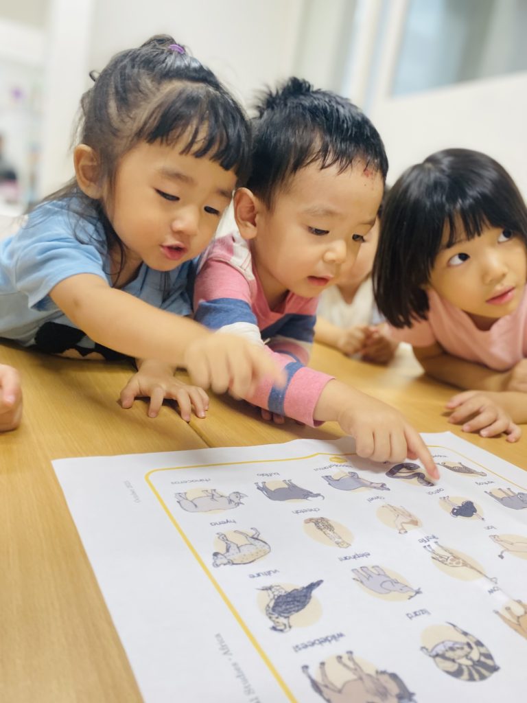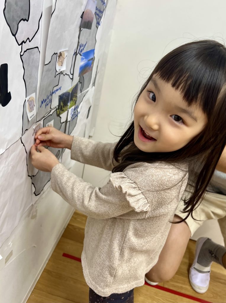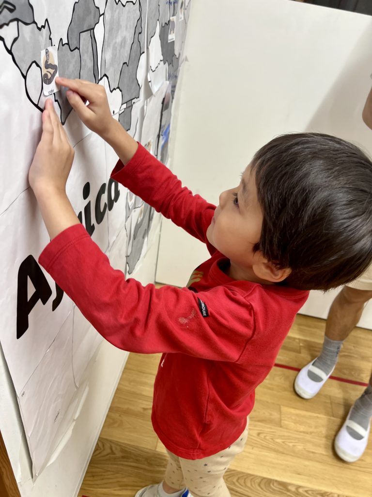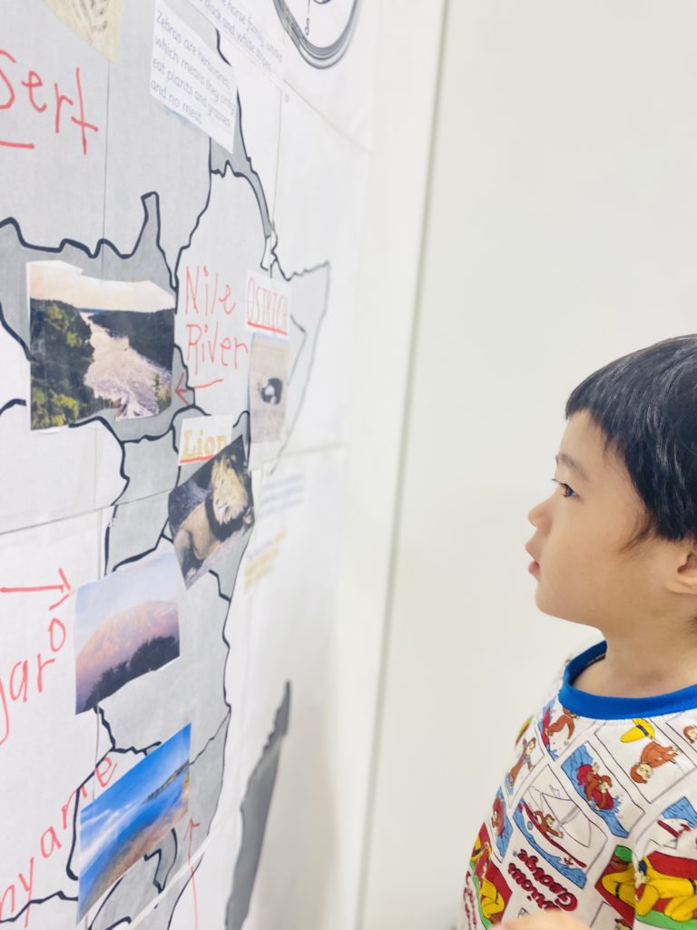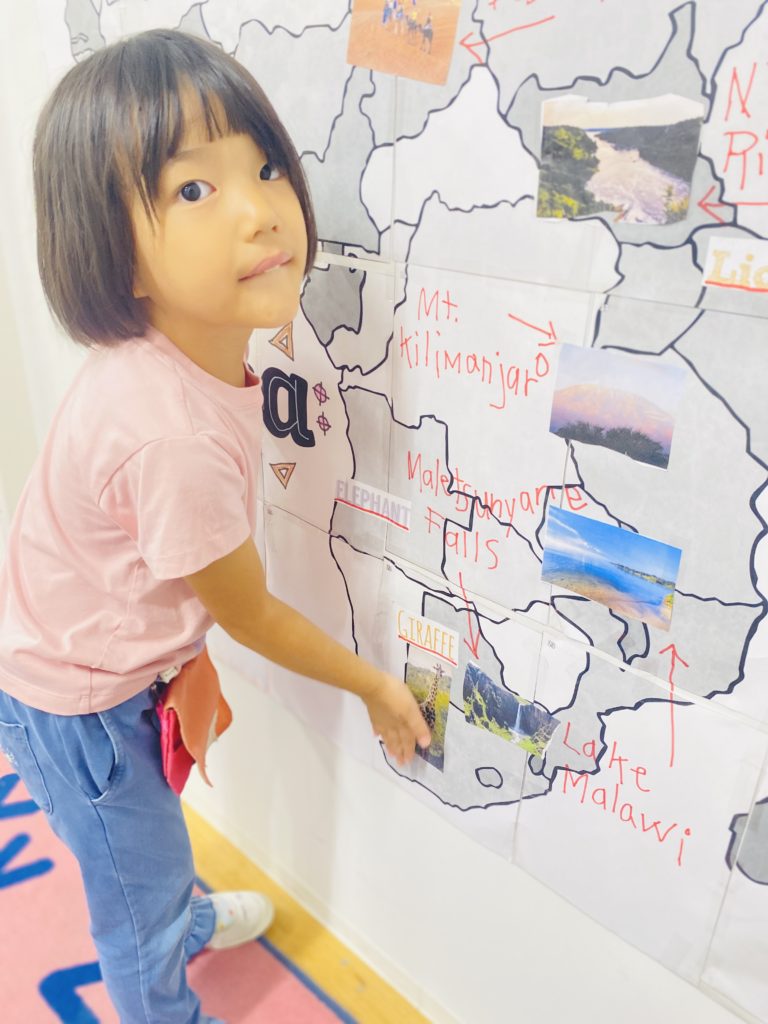 先週みんなで作ったアフリカ地図に、今日覚えた動物たちの写真と特徴をぺたぺた追加していきました。