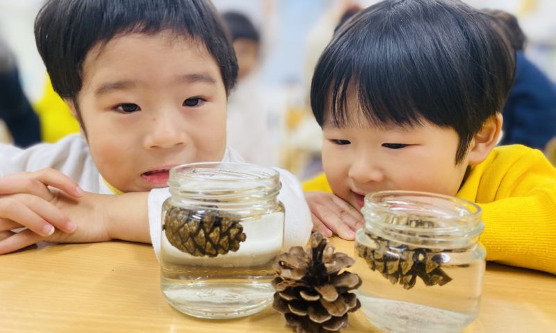 今回は、冬の森にぴったりな 松ぼっくりの実験 をしました!