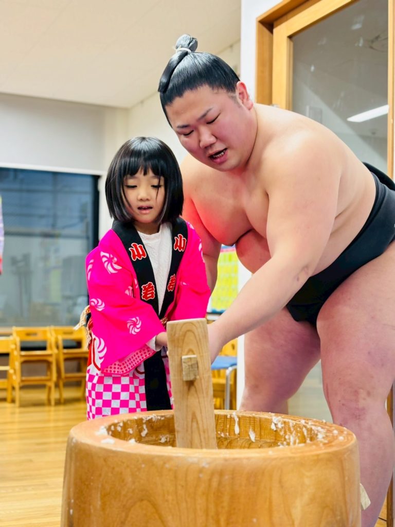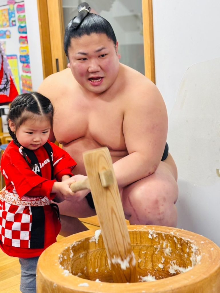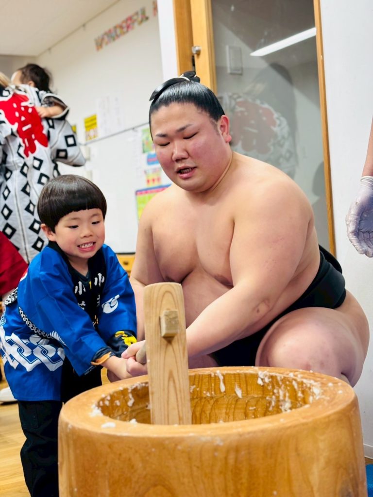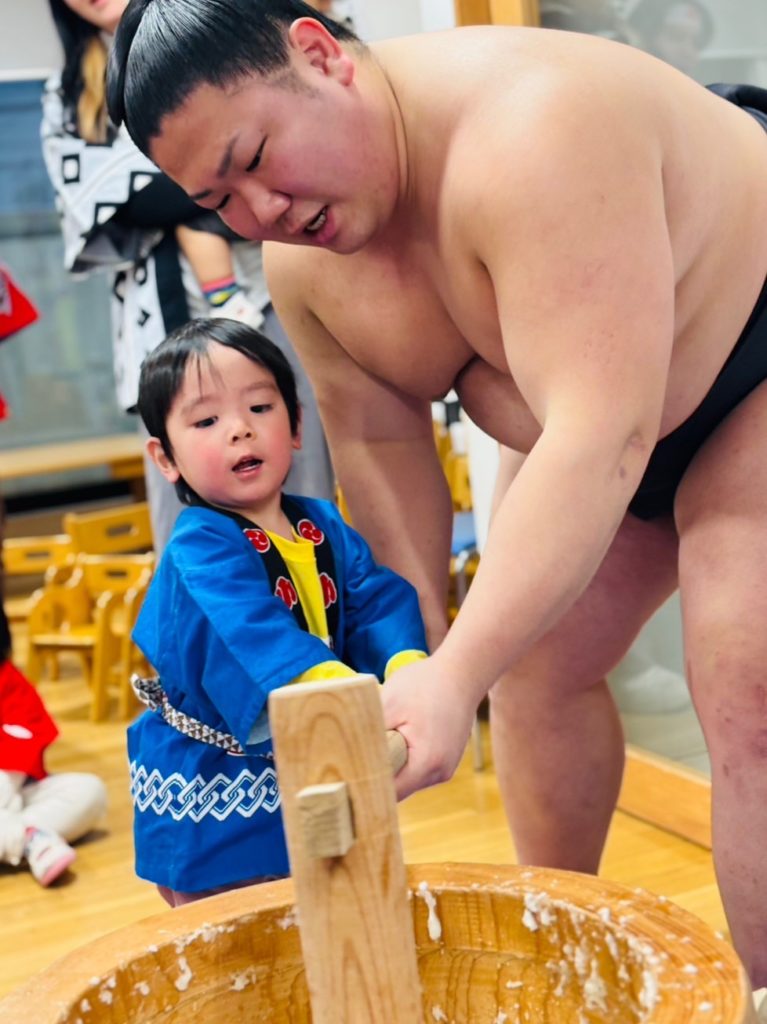 大きな体で力強くお餅をつく姿に、子どもたちはじっと見入っていました。