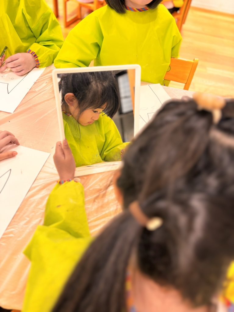 子どもたちは鏡を見ながら、自分の目や鼻、表情をじっくり観察👀
